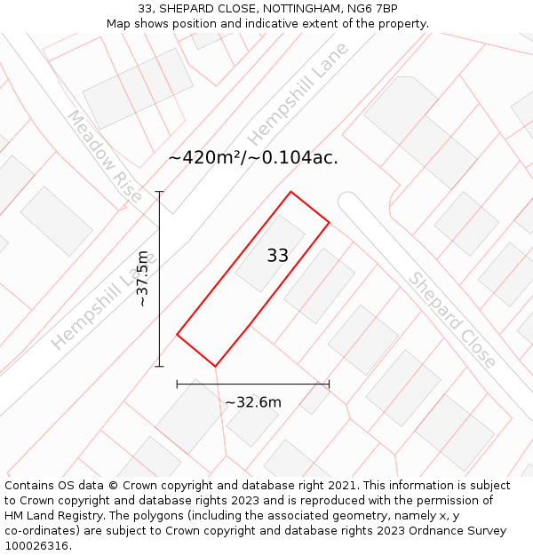 33 SHEPARD CLOSE sits on a plot of roughly 0.104 of an acre, or 420m². The below map shows the location of 33 SHEPARD CLOSE, an approximate outline of the building(s), and the indicative extent of the property. The plot extent is a Land Registry INSPIRE Index Polygon, and it is important to note that a title may include more than one polygon, whereas only one polygon is shown on the map (the polygon which intersects with the position of 33 SHEPARD CLOSE). The full extent of the land contained in any registered title can only be identified from the individual title plan. The maps on this page should not be relied upon to establish the extent of a title.