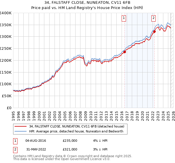 The below graph shows the average detached house price in the Nuneaton and Bedworth local authority area over time, sourced from the HPI. The two 34 FALSTAFF CLOSE sales from August 2016 and May 2022 have been plotted on the graph. A line has been extrapolated to show what the value of the property might have been over time, following each sale, had it maintained the same margin above or below the HPI (as a percentage). For example, the August 2016 sale was for 4% below the HPI. So the extrapolation line tracks at 4% below the HPI over time, until the May 2022 sale, where it rises to 3% below the HPI. The line then continues to track at 3% below the HPI.