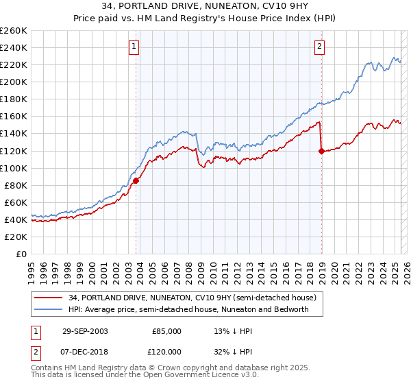 The below graph shows the average semi-detached house price in the Nuneaton and Bedworth local authority area over time, sourced from the HPI. The two 34 PORTLAND DRIVE sales from September 2003 and December 2018 have been plotted on the graph. A line has been extrapolated to show what the value of the property might have been over time, following each sale, had it maintained the same margin above or below the HPI (as a percentage). For example, the September 2003 sale was for 13% below the HPI. So the extrapolation line tracks at 13% below the HPI over time, until the December 2018 sale, where it falls to 32% below the HPI. The line then continues to track at 32% below the HPI.