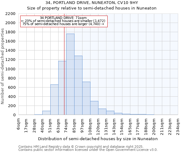 34 PORTLAND DRIVE is 71m² according to the EPC inspection conducted in October 2020. This puts it in the smallest 10% of semi-detached houses houses in Nuneaton, based on EPC data. The below chart shows the distribution of semi-detached houses houses by size in Nuneaton, and where 34 PORTLAND DRIVE lies on this distribution: 6% of semi-detached houses houses are smaller than 34 PORTLAND DRIVE, and 94% of houses are larger. Note that EPC data is not available for all properties in Nuneaton.
