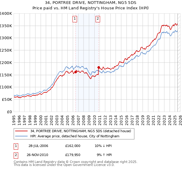 The below graph shows the average detached house price in the City of Nottingham local authority area over time, sourced from the HPI. The two 34 PORTREE DRIVE sales from July 2006 and November 2010 have been plotted on the graph. A line has been extrapolated to show what the value of the property might have been over time, following each sale, had it maintained the same margin above or below the HPI (as a percentage). For example, the July 2006 sale was for 10% below the HPI. So the extrapolation line tracks at 10% below the HPI over time, until the November 2010 sale, where it rises to 9% above the HPI. The line then continues to track at 9% above the HPI.