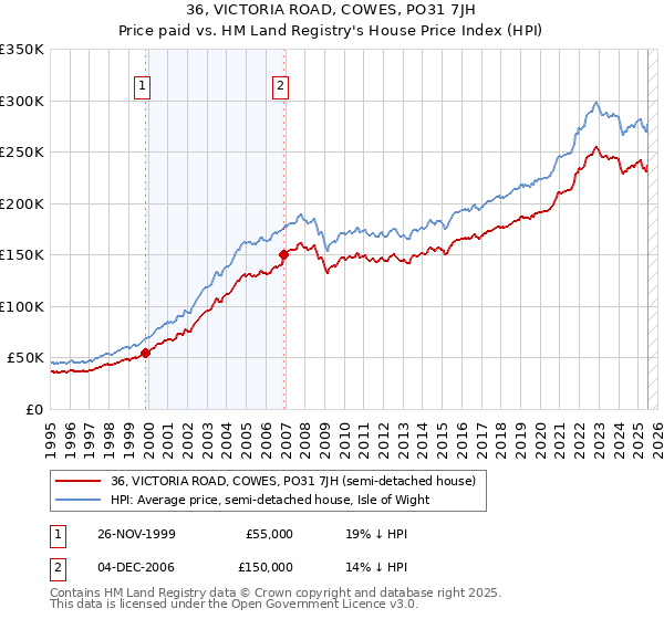 The below graph shows the average semi-detached house price in the Isle of Wight local authority area over time, sourced from the HPI. The two 36 VICTORIA ROAD sales from November 1999 and December 2006 have been plotted on the graph. A line has been extrapolated to show what the value of the property might have been over time, following each sale, had it maintained the same margin above or below the HPI (as a percentage). For example, the November 1999 sale was for 19% below the HPI. So the extrapolation line tracks at 19% below the HPI over time, until the December 2006 sale, where it rises to 14% below the HPI. The line then continues to track at 14% below the HPI.
