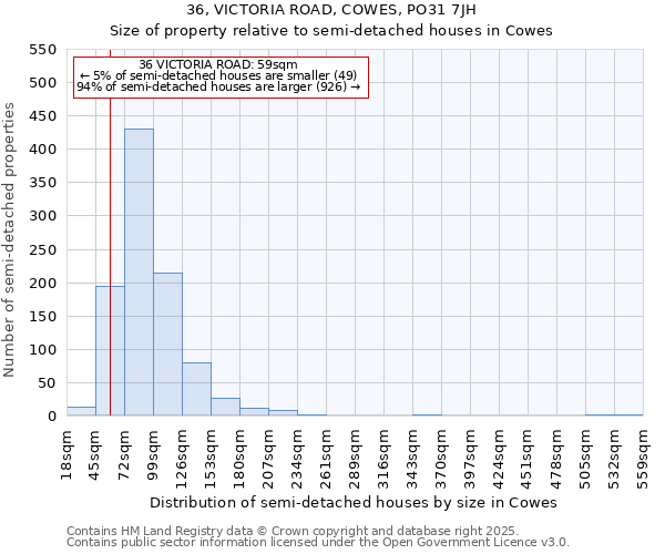 36 VICTORIA ROAD is 59m² according to the EPC inspection conducted in December 2022. This puts it in the smallest 10% of semi-detached houses houses in Cowes, based on EPC data. The below chart shows the distribution of semi-detached houses houses by size in Cowes, and where 36 VICTORIA ROAD lies on this distribution: 5% of semi-detached houses houses are smaller than 36 VICTORIA ROAD, and 95% of houses are larger. Note that EPC data is not available for all properties in Cowes.