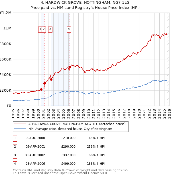 The below graph shows the average detached house price in the City of Nottingham local authority area over time, sourced from the HPI. The four 4 HARDWICK GROVE sales between August 2000 and April 2006 have been plotted on the graph. A line has been extrapolated to show what the value of the property might have been over time, following each sale, had it maintained the same margin above or below the HPI (as a percentage). For example, the August 2002 sale was for 166% above the HPI. So the extrapolation line tracks at 166% above the HPI over time, until the April 2006 sale, where it rises to 183% above the HPI. The line then continues to track at 183% above the HPI.