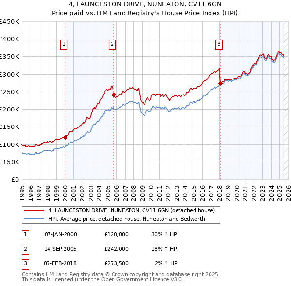 The below graph shows the average detached house price in the Nuneaton and Bedworth local authority area over time, sourced from the HPI. The three 4 LAUNCESTON DRIVE sales between January 2000 and February 2018 have been plotted on the graph. A line has been extrapolated to show what the value of the property might have been over time, following each sale, had it maintained the same margin above or below the HPI (as a percentage). For example, the September 2005 sale was for 18% above the HPI. So the extrapolation line tracks at 18% above the HPI over time, until the February 2018 sale, where it falls to 2% above the HPI. The line then continues to track at 2% above the HPI.