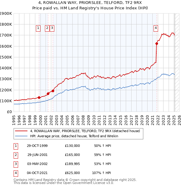 The below graph shows the average detached house price in the Telford and Wrekin local authority area over time, sourced from the HPI. The four 4 ROWALLAN WAY sales between October 1999 and October 2021 have been plotted on the graph. A line has been extrapolated to show what the value of the property might have been over time, following each sale, had it maintained the same margin above or below the HPI (as a percentage). For example, the May 2002 sale was for 53% above the HPI. So the extrapolation line tracks at 53% above the HPI over time, until the October 2021 sale, where it rises to 107% above the HPI. The line then continues to track at 107% above the HPI.