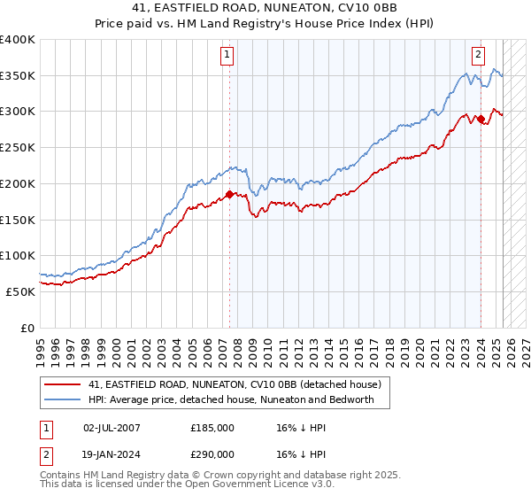 The below graph shows the average detached house price in the Nuneaton and Bedworth local authority area over time, sourced from the HPI. The two 41 EASTFIELD ROAD sales from July 2007 and January 2024 have been plotted on the graph. A line has been extrapolated to show what the value of the property might have been over time, following each sale, had it maintained the same margin above or below the HPI (as a percentage). For example, the July 2007 sale was for 16% below the HPI. So the extrapolation line tracks at 16% below the HPI over time, until the January 2024 sale, which was also at 16% below the HPI.