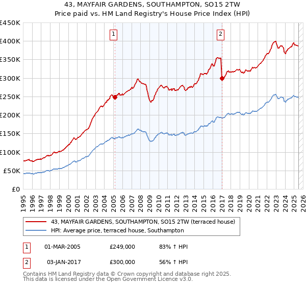 The below graph shows the average terraced house price in the Southampton local authority area over time, sourced from the HPI. The two 43 MAYFAIR GARDENS sales from March 2005 and January 2017 have been plotted on the graph. A line has been extrapolated to show what the value of the property might have been over time, following each sale, had it maintained the same margin above or below the HPI (as a percentage). For example, the March 2005 sale was for 83% above the HPI. So the extrapolation line tracks at 83% above the HPI over time, until the January 2017 sale, where it falls to 56% above the HPI. The line then continues to track at 56% above the HPI.