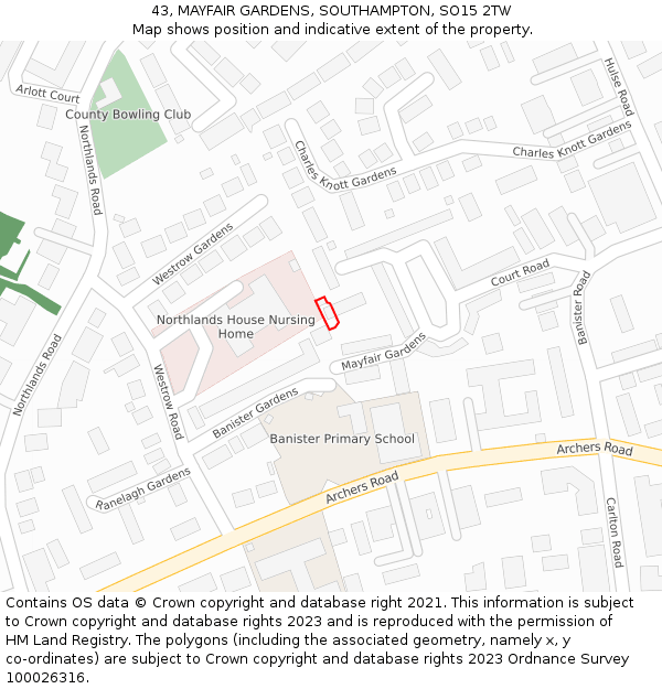 43 MAYFAIR GARDENS sits on a plot of roughly 0.051 of an acre, or 206m². The below map shows the location of 43 MAYFAIR GARDENS, an approximate outline of the building(s), and the indicative extent of the property. The plot extent is a Land Registry INSPIRE Index Polygon, and it is important to note that a title may include more than one polygon, whereas only one polygon is shown on the map (the polygon which intersects with the position of 43 MAYFAIR GARDENS). The full extent of the land contained in any registered title can only be identified from the individual title plan. The maps on this page should not be relied upon to establish the extent of a title.
