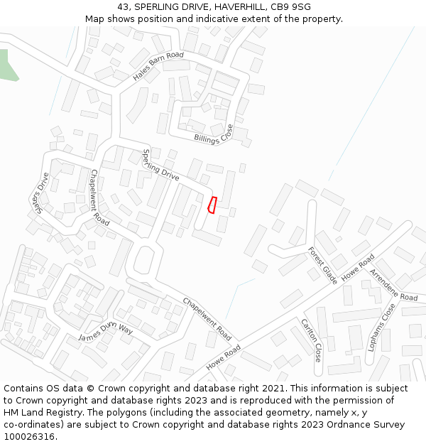 43 SPERLING DRIVE sits on a plot of roughly 0.027 of an acre, or 110m². The below map shows the location of 43 SPERLING DRIVE, an approximate outline of the building(s), and the indicative extent of the property. The plot extent is a Land Registry INSPIRE Index Polygon, and it is important to note that a title may include more than one polygon, whereas only one polygon is shown on the map (the polygon which intersects with the position of 43 SPERLING DRIVE). The full extent of the land contained in any registered title can only be identified from the individual title plan. The maps on this page should not be relied upon to establish the extent of a title.