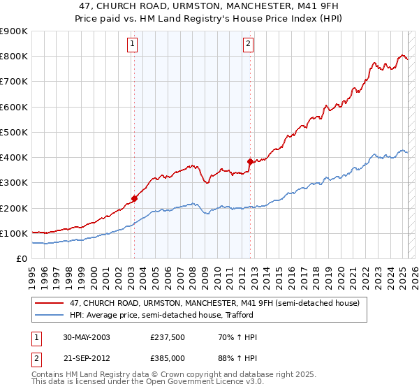 The below graph shows the average semi-detached house price in the Trafford local authority area over time, sourced from the HPI. The two 47 CHURCH ROAD sales from May 2003 and September 2012 have been plotted on the graph. A line has been extrapolated to show what the value of the property might have been over time, following each sale, had it maintained the same margin above or below the HPI (as a percentage). For example, the May 2003 sale was for 70% above the HPI. So the extrapolation line tracks at 70% above the HPI over time, until the September 2012 sale, where it rises to 88% above the HPI. The line then continues to track at 88% above the HPI.