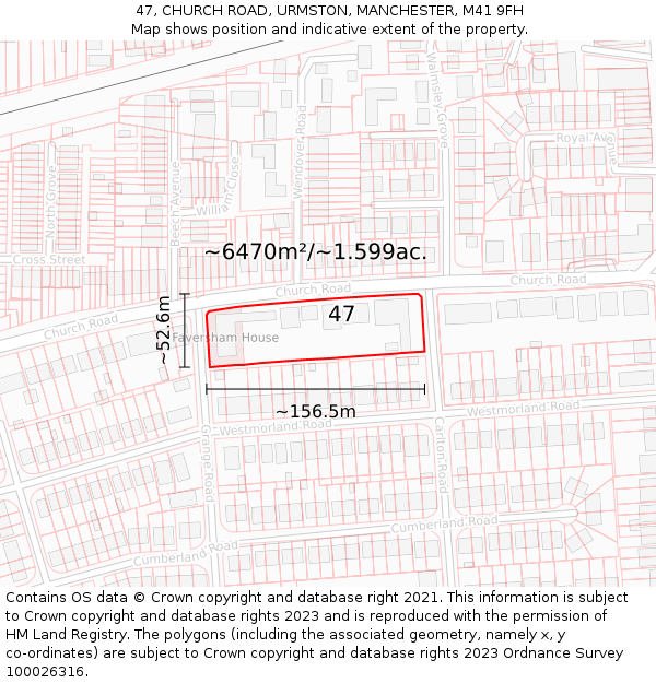 47 CHURCH ROAD sits on a plot of roughly 1.6 acres, or 6,470m². The below map shows the location of 47 CHURCH ROAD, an approximate outline of the building(s), and the indicative extent of the property. The plot extent is a Land Registry INSPIRE Index Polygon, and it is important to note that a title may include more than one polygon, whereas only one polygon is shown on the map (the polygon which intersects with the position of 47 CHURCH ROAD). The full extent of the land contained in any registered title can only be identified from the individual title plan. The maps on this page should not be relied upon to establish the extent of a title.