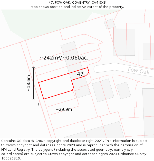 47 FOW OAK sits on a plot of roughly 0.060 of an acre, or 242m². The below map shows the location of 47 FOW OAK, an approximate outline of the building(s), and the indicative extent of the property. The plot extent is a Land Registry INSPIRE Index Polygon, and it is important to note that a title may include more than one polygon, whereas only one polygon is shown on the map (the polygon which intersects with the position of 47 FOW OAK). The full extent of the land contained in any registered title can only be identified from the individual title plan. The maps on this page should not be relied upon to establish the extent of a title.