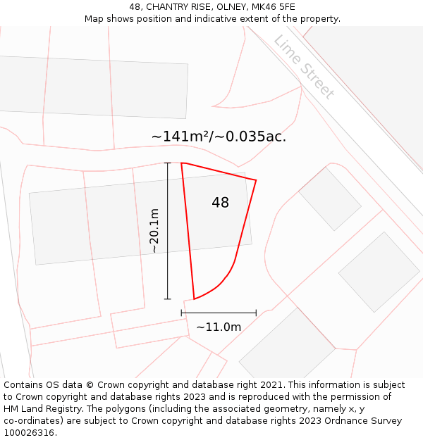 48 CHANTRY RISE sits on a plot of roughly 0.035 of an acre, or 141m². The below map shows the location of 48 CHANTRY RISE, an approximate outline of the building(s), and the indicative extent of the property. The plot extent is a Land Registry INSPIRE Index Polygon, and it is important to note that a title may include more than one polygon, whereas only one polygon is shown on the map (the polygon which intersects with the position of 48 CHANTRY RISE). The full extent of the land contained in any registered title can only be identified from the individual title plan. The maps on this page should not be relied upon to establish the extent of a title.