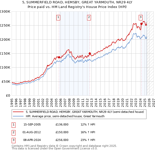 The below graph shows the average semi-detached house price in the Great Yarmouth local authority area over time, sourced from the HPI. The three 5 SUMMERFIELD ROAD sales between September 2005 and April 2024 have been plotted on the graph. A line has been extrapolated to show what the value of the property might have been over time, following each sale, had it maintained the same margin above or below the HPI (as a percentage). For example, the August 2012 sale was for 16% above the HPI. So the extrapolation line tracks at 16% above the HPI over time, until the April 2024 sale, where it rises to 23% above the HPI. The line then continues to track at 23% above the HPI.