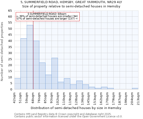 5 SUMMERFIELD ROAD is 68m², which includes one extension, according to the EPC inspection conducted in December 2022. This puts it in the smallest 20% of semi-detached houses houses in Hemsby, based on EPC data. The below chart shows the distribution of semi-detached houses houses by size in Hemsby, and where 5 SUMMERFIELD ROAD lies on this distribution: 15% of semi-detached houses houses are smaller than 5 SUMMERFIELD ROAD, and 85% of houses are larger. Note that EPC data is not available for all properties in Hemsby.