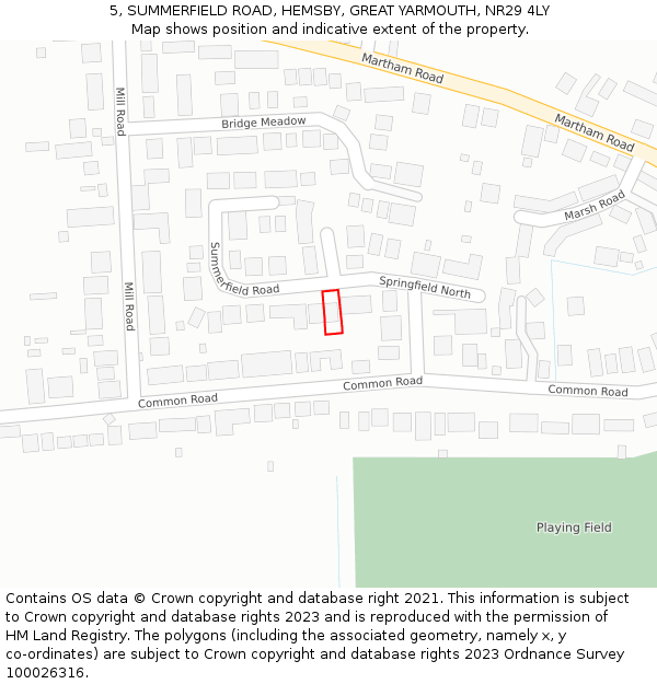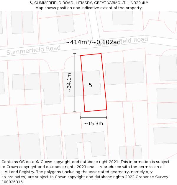 5 SUMMERFIELD ROAD sits on a plot of roughly 0.102 of an acre, or 414m². The below map shows the location of 5 SUMMERFIELD ROAD, an approximate outline of the building(s), and the indicative extent of the property. The plot extent is a Land Registry INSPIRE Index Polygon, and it is important to note that a title may include more than one polygon, whereas only one polygon is shown on the map (the polygon which intersects with the position of 5 SUMMERFIELD ROAD). The full extent of the land contained in any registered title can only be identified from the individual title plan. The maps on this page should not be relied upon to establish the extent of a title.