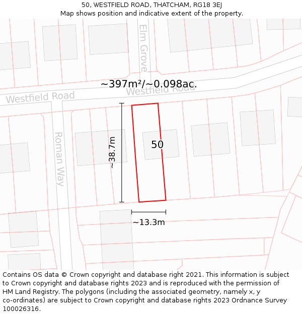 50 WESTFIELD ROAD sits on a plot of roughly 0.098 of an acre, or 397m². The below map shows the location of 50 WESTFIELD ROAD, an approximate outline of the building(s), and the indicative extent of the property. The plot extent is a Land Registry INSPIRE Index Polygon, and it is important to note that a title may include more than one polygon, whereas only one polygon is shown on the map (the polygon which intersects with the position of 50 WESTFIELD ROAD). The full extent of the land contained in any registered title can only be identified from the individual title plan. The maps on this page should not be relied upon to establish the extent of a title.