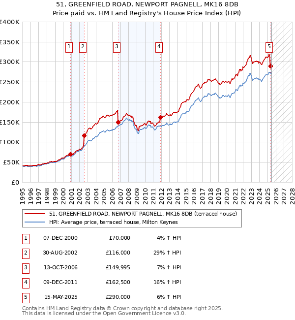 The below graph shows the average terraced house price in the Milton Keynes local authority area over time, sourced from the HPI. The five 51 GREENFIELD ROAD sales between December 2000 and May 2025 have been plotted on the graph. A line has been extrapolated to show what the value of the property might have been over time, following each sale, had it maintained the same margin above or below the HPI (as a percentage). For example, the December 2011 sale was for 16% above the HPI. So the extrapolation line tracks at 16% above the HPI over time, until the May 2025 sale, where it falls to 6% above the HPI. The line then continues to track at 6% above the HPI.