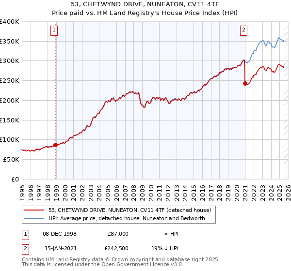 The below graph shows the average detached house price in the Nuneaton and Bedworth local authority area over time, sourced from the HPI. The two 53 CHETWYND DRIVE sales from December 1998 and January 2021 have been plotted on the graph. A line has been extrapolated to show what the value of the property might have been over time, following each sale, had it maintained the same margin above or below the HPI (as a percentage). For example, the December 1998 sale roughly matched the HPI. So the extrapolation line tracks roughly in line with the HPI over time, until the January 2021 sale, where it falls to 19% below the HPI. The line then continues to track at 19% below the HPI.