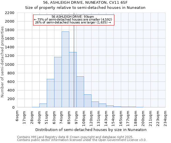 56 ASHLEIGH DRIVE is 93m² according to the EPC inspection conducted in August 2016. This puts it in the smallest 30% of semi-detached houses houses in Nuneaton, based on EPC data. The below chart shows the distribution of semi-detached houses houses by size in Nuneaton, and where 56 ASHLEIGH DRIVE lies on this distribution: 28% of semi-detached houses houses are smaller than 56 ASHLEIGH DRIVE, and 71% of houses are larger. Note that EPC data is not available for all properties in Nuneaton.