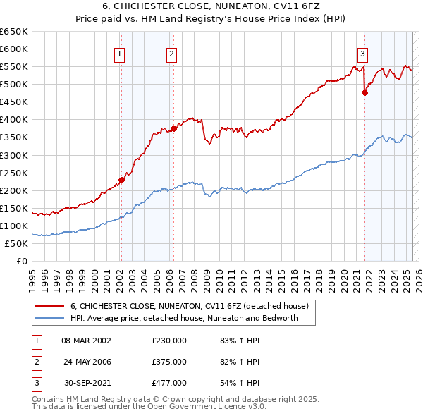 The below graph shows the average detached house price in the Nuneaton and Bedworth local authority area over time, sourced from the HPI. The three 6 CHICHESTER CLOSE sales between March 2002 and September 2021 have been plotted on the graph. A line has been extrapolated to show what the value of the property might have been over time, following each sale, had it maintained the same margin above or below the HPI (as a percentage). For example, the May 2006 sale was for 82% above the HPI. So the extrapolation line tracks at 82% above the HPI over time, until the September 2021 sale, where it falls to 54% above the HPI. The line then continues to track at 54% above the HPI.