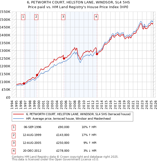 The below graph shows the average terraced house price in the Windsor and Maidenhead local authority area over time, sourced from the HPI. The four 6 PETWORTH COURT sales between September 1996 and December 2012 have been plotted on the graph. A line has been extrapolated to show what the value of the property might have been over time, following each sale, had it maintained the same margin above or below the HPI (as a percentage). For example, the August 2005 sale was for 9% above the HPI. So the extrapolation line tracks at 9% above the HPI over time, until the December 2012 sale, where it falls to 3% below the HPI. The line then continues to track at 3% below the HPI.