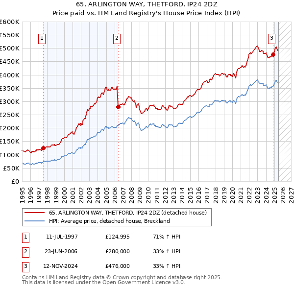 The below graph shows the average detached house price in the Breckland local authority area over time, sourced from the HPI. The three 65 ARLINGTON WAY sales between July 1997 and November 2024 have been plotted on the graph. A line has been extrapolated to show what the value of the property might have been over time, following each sale, had it maintained the same margin above or below the HPI (as a percentage). For example, the June 2006 sale was for 33% above the HPI. So the extrapolation line tracks at 33% above the HPI over time, until the November 2024 sale, which was also at 33% above the HPI.
