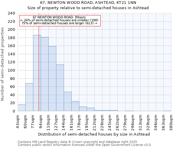 67 NEWTON WOOD ROAD is 89m² according to the EPC inspection conducted in May 2017. This puts it in the smallest 10% of semi-detached houses houses in Ashtead, based on EPC data. The below chart shows the distribution of semi-detached houses houses by size in Ashtead, and where 67 NEWTON WOOD ROAD lies on this distribution: 6% of semi-detached houses houses are smaller than 67 NEWTON WOOD ROAD, and 94% of houses are larger. Note that EPC data is not available for all properties in Ashtead.