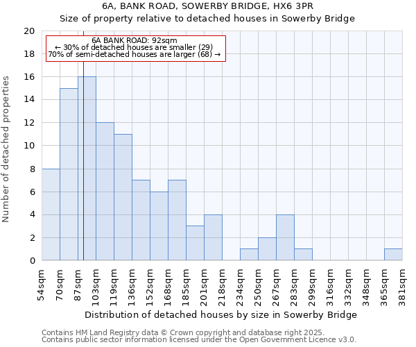 6A BANK ROAD is 92m², which includes one extension, according to the EPC inspection conducted in February 2023. This puts it in the smallest 30% of detached houses houses in Sowerby Bridge, based on EPC data. The below chart shows the distribution of detached houses houses by size in Sowerby Bridge, and where 6A BANK ROAD lies on this distribution: 30% of detached houses houses are smaller than 6A BANK ROAD, and 70% of houses are larger. Note that EPC data is not available for all properties in Sowerby Bridge.