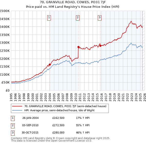 The below graph shows the average semi-detached house price in the Isle of Wight local authority area over time, sourced from the HPI. The three 70 GRANVILLE ROAD sales between January 2004 and October 2015 have been plotted on the graph. A line has been extrapolated to show what the value of the property might have been over time, following each sale, had it maintained the same margin above or below the HPI (as a percentage). For example, the September 2010 sale was for 55% above the HPI. So the extrapolation line tracks at 55% above the HPI over time, until the October 2015 sale, where it falls to 46% above the HPI. The line then continues to track at 46% above the HPI.