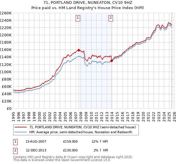 The below graph shows the average semi-detached house price in the Nuneaton and Bedworth local authority area over time, sourced from the HPI. The two 71 PORTLAND DRIVE sales from August 2007 and December 2013 have been plotted on the graph. A line has been extrapolated to show what the value of the property might have been over time, following each sale, had it maintained the same margin above or below the HPI (as a percentage). For example, the August 2007 sale was for 12% above the HPI. So the extrapolation line tracks at 12% above the HPI over time, until the December 2013 sale, where it falls to 2% above the HPI. The line then continues to track at 2% above the HPI.