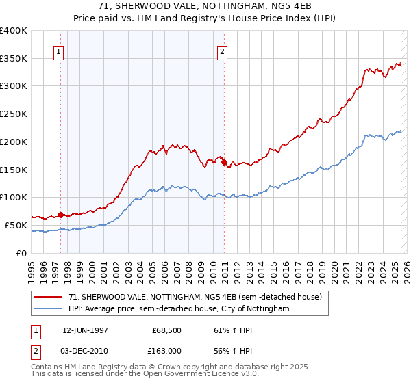 The below graph shows the average semi-detached house price in the City of Nottingham local authority area over time, sourced from the HPI. The two 71 SHERWOOD VALE sales from June 1997 and December 2010 have been plotted on the graph. A line has been extrapolated to show what the value of the property might have been over time, following each sale, had it maintained the same margin above or below the HPI (as a percentage). For example, the June 1997 sale was for 61% above the HPI. So the extrapolation line tracks at 61% above the HPI over time, until the December 2010 sale, where it falls to 56% above the HPI. The line then continues to track at 56% above the HPI.