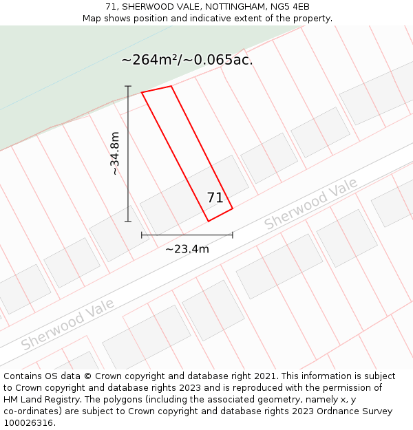 71 SHERWOOD VALE sits on a plot of roughly 0.065 of an acre, or 264m². The below map shows the location of 71 SHERWOOD VALE, an approximate outline of the building(s), and the indicative extent of the property. The plot extent is a Land Registry INSPIRE Index Polygon, and it is important to note that a title may include more than one polygon, whereas only one polygon is shown on the map (the polygon which intersects with the position of 71 SHERWOOD VALE). The full extent of the land contained in any registered title can only be identified from the individual title plan. The maps on this page should not be relied upon to establish the extent of a title.