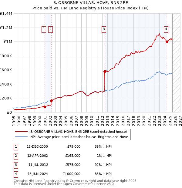 The below graph shows the average semi-detached house price in the Brighton and Hove local authority area over time, sourced from the HPI. The four 8 OSBORNE VILLAS sales between December 2000 and June 2024 have been plotted on the graph. A line has been extrapolated to show what the value of the property might have been over time, following each sale, had it maintained the same margin above or below the HPI (as a percentage). For example, the July 2012 sale was for 92% above the HPI. So the extrapolation line tracks at 92% above the HPI over time, until the June 2024 sale, where it falls to 88% above the HPI. The line then continues to track at 88% above the HPI.