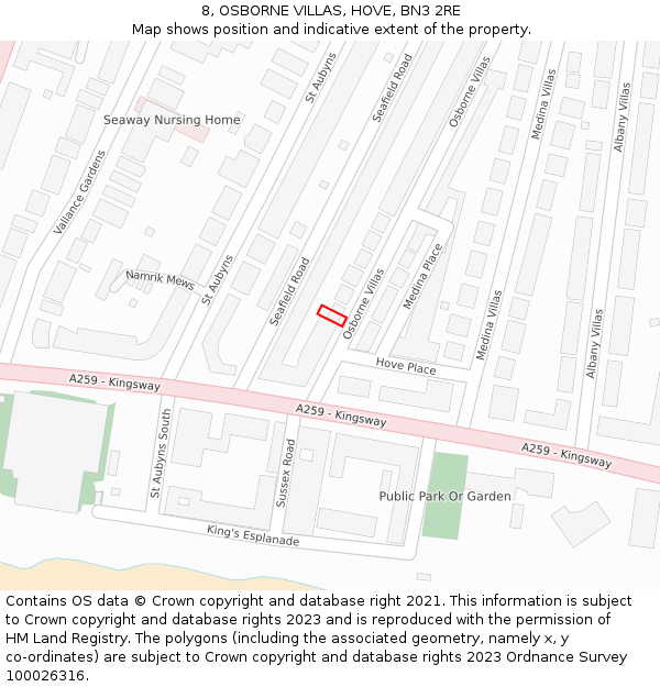 8 OSBORNE VILLAS sits on a plot of roughly 0.039 of an acre, or 158m². The below map shows the location of 8 OSBORNE VILLAS, an approximate outline of the building(s), and the indicative extent of the property. The plot extent is a Land Registry INSPIRE Index Polygon, and it is important to note that a title may include more than one polygon, whereas only one polygon is shown on the map (the polygon which intersects with the position of 8 OSBORNE VILLAS). The full extent of the land contained in any registered title can only be identified from the individual title plan. The maps on this page should not be relied upon to establish the extent of a title.