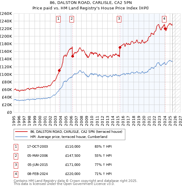 The below graph shows the average terraced house price in the Cumberland local authority area over time, sourced from the HPI. The four 86 DALSTON ROAD sales between October 2003 and February 2024 have been plotted on the graph. A line has been extrapolated to show what the value of the property might have been over time, following each sale, had it maintained the same margin above or below the HPI (as a percentage). For example, the June 2015 sale was for 77% above the HPI. So the extrapolation line tracks at 77% above the HPI over time, until the February 2024 sale, where it falls to 71% above the HPI. The line then continues to track at 71% above the HPI.