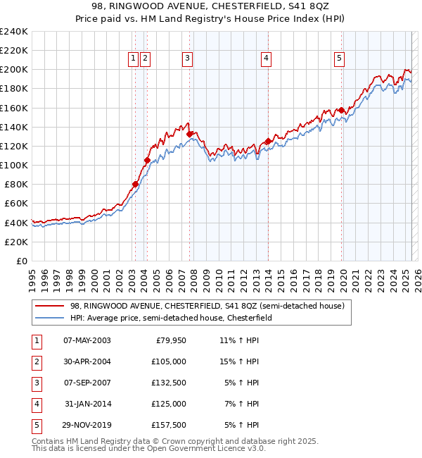 Land registry data shows five sales for 98 RINGWOOD AVENUE since 1st January 1995. The below table shows the price paid for the five sales, along with the average semi-detached price in the Chesterfield local authority area for the corresponding sale date. All of the five 98 RINGWOOD AVENUE sales were for above the average price. The average price is sourced from the Office for National Statistics' House Price Index (HPI).