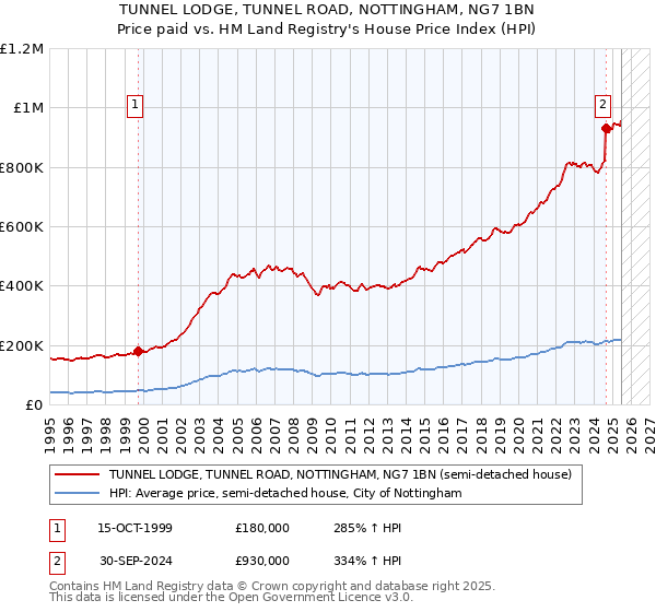 The below graph shows the average semi-detached house price in the City of Nottingham local authority area over time, sourced from the HPI. The two TUNNEL LODGE sales from October 1999 and September 2024 have been plotted on the graph. A line has been extrapolated to show what the value of the property might have been over time, following each sale, had it maintained the same margin above or below the HPI (as a percentage). For example, the October 1999 sale was for 285% above the HPI. So the extrapolation line tracks at 285% above the HPI over time, until the September 2024 sale, where it rises to 334% above the HPI. The line then continues to track at 334% above the HPI.
